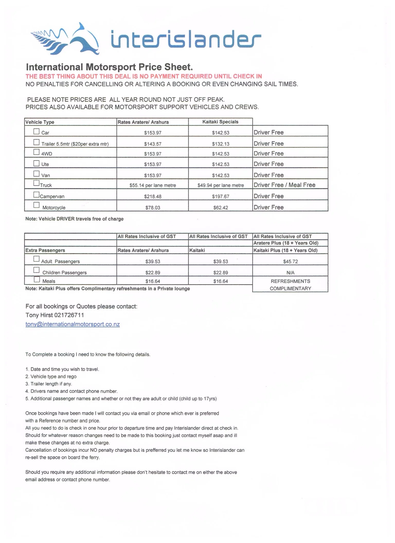 by calling Tony Hirst of International Motorsport on 021 726 711. The price sheet below is 5 years old so please get current prices from Tony.
